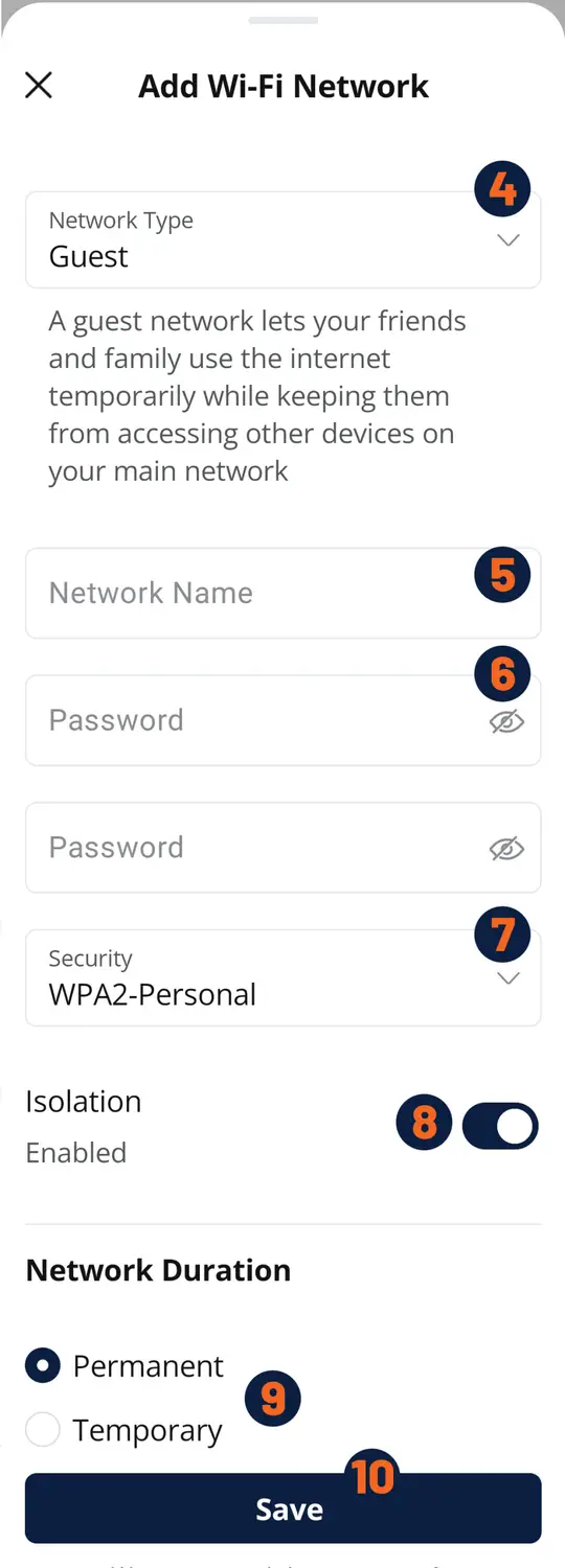 - Under Duration, choose Permanent or Temporary. Permanent will retain the Guest Wi-Fi until you disable it. Temporary allows you to set a start date/time and end date/time.